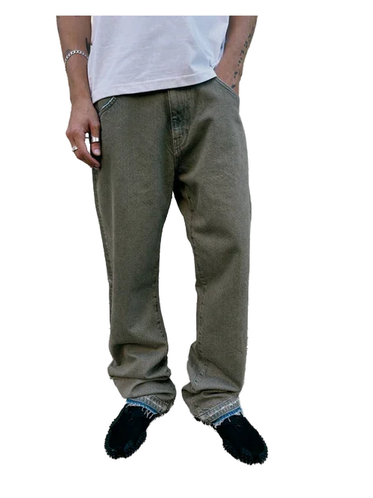 Amish reinterpreta il denim con il modello James in versione Mud Overdyed, realizzato in cotone riciclato. Il lavaggio marrone fango, con leggere sfumature vissute, regala un fascino autentico e una grande versatilità, mentre la vita media con passanti è completata dal caratteristico passante in tessuto logato sul retro. La chiusura a bottone e zip si abbina a tasche frontali e posteriori impreziosite da ricami in contrasto. Il fit regolare e la gamba ampia assicurano comfort e libertà di movimento, perfetti per un look casual dal carattere deciso.